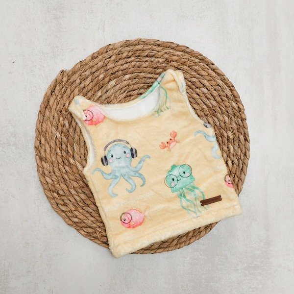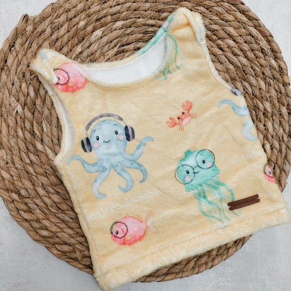 El chaleco es de polar soft bifaz con estampado realizado exclusivamente para sonajero.de.coco. Es muy suave y abrigado. Tiene cuello americano para facilitar el paso de la cabeza del bebé.