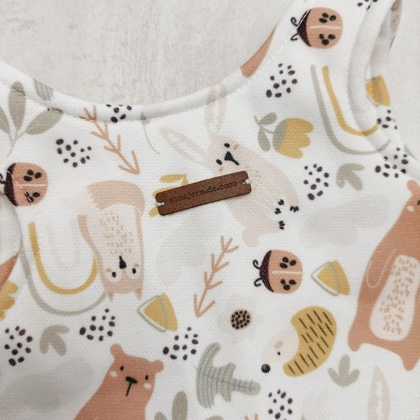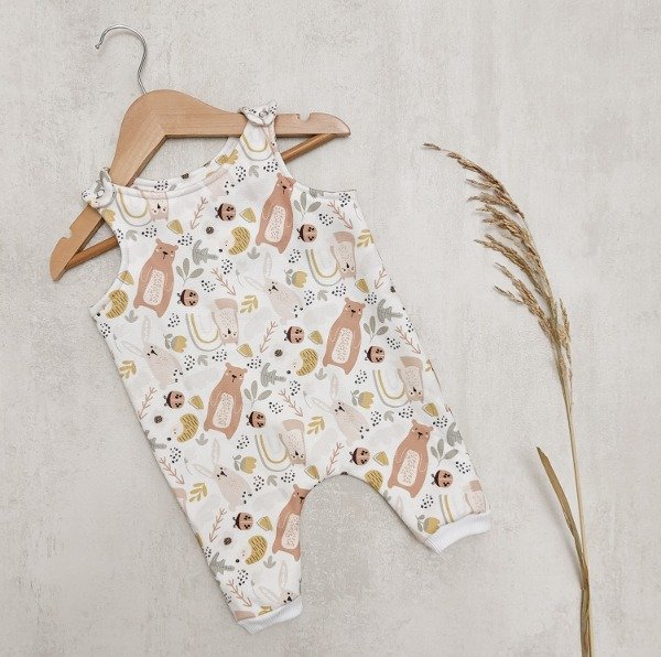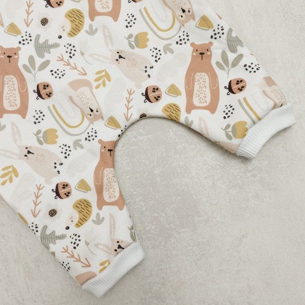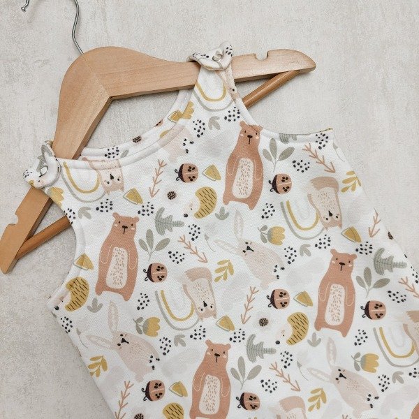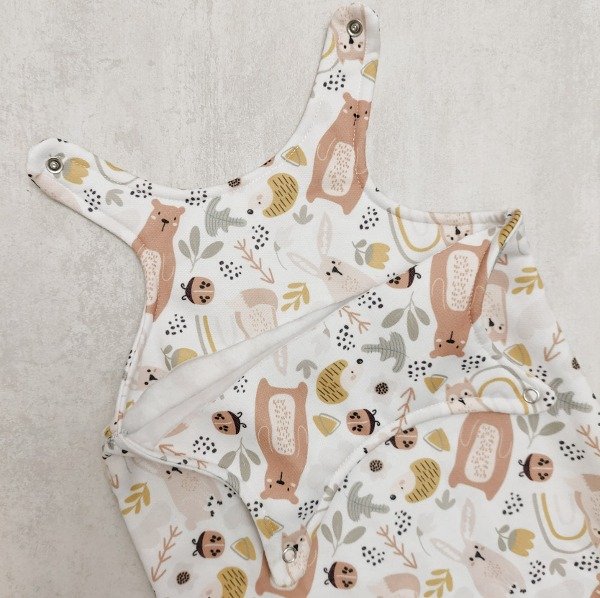 Enterito tipo Romper de friza estampada. Tiene broches metálicos en los tirantes y puños al tono.